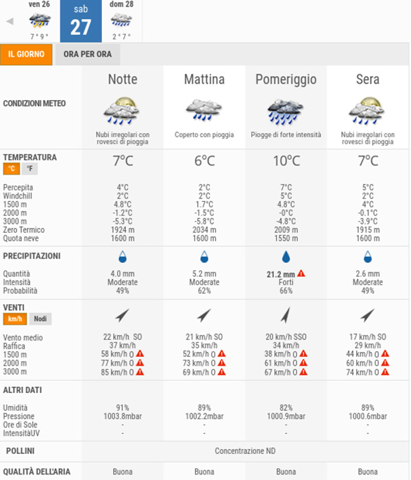 Secondo gli esperti di 3bmeteo, domani, Sabato 27 Novembre, avremo giornata perturbata con piogge e rovesci diffusi, anche a carattere temporalesco.