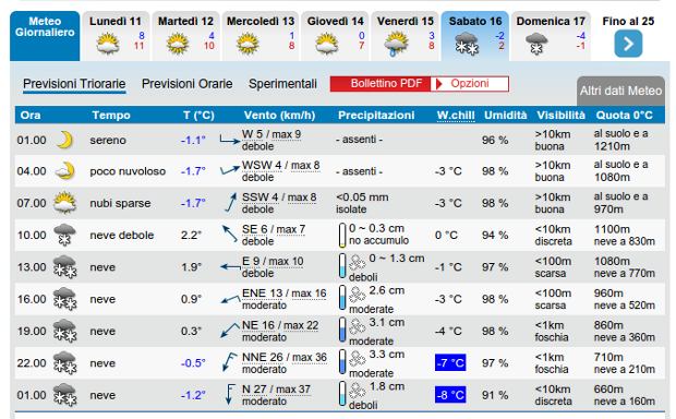 Di seguito un’immagine con il dettaglio delle previsioni meteo di Potenza per la giornata di sabato 16 Gennaio, giorno in cui è previsto l’arrivo della prima neve del 2016 nel capoluogo lucano.