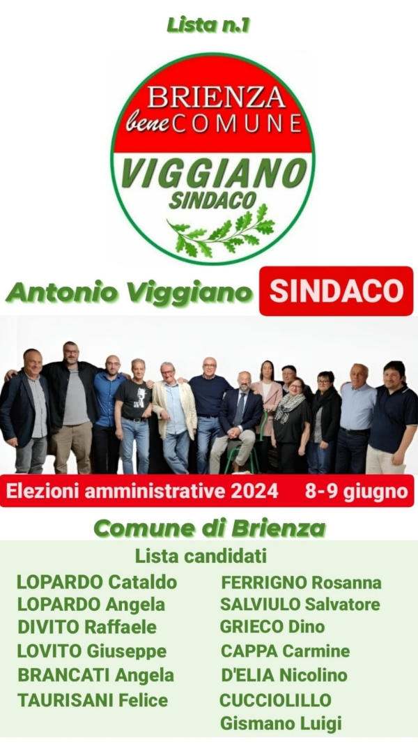 Brienza bene Comune, è questo il nome della Lista civica n.1, che Antonio Viggiano capeggerà alle prossime elezioni Amministrative dell’8 e 9 giugno 2024 nel Comune di Brienza.