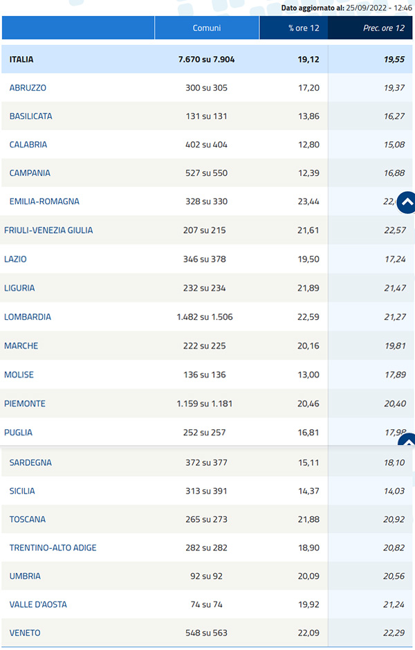 Il Viminale ha comunicato in questi minuti che alle ore 12:00 il 19,22% degli elettori è andato a votare (dato in aggiornamento).