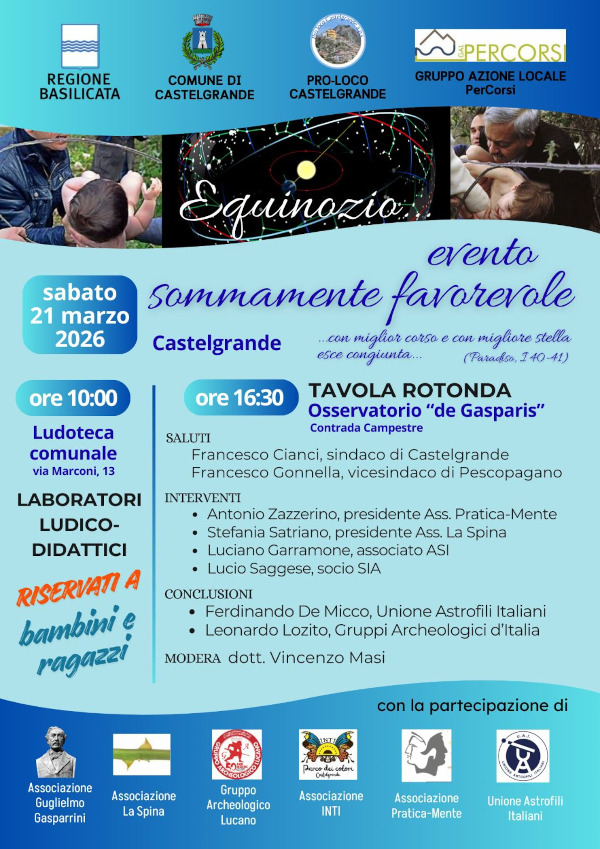 Sabato 21 marzo 2026, a partire dalle ore 10:00 e per l’intera giornata, Castelgrande ospiterà “Equinozio… evento sommamente favorevole”, iniziativa dedicata all’astronomia culturale e alla valorizzazione delle tradizioni locali.