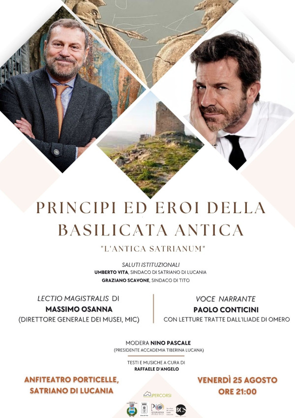 “Principi ed eroi della Basilicata antica – L’antica Satrianum” Lectio magistralis di MASSIMO OSANNA, il direttore generale dei Musei del Ministero della Cultura e letture dall’Iliade con l’attore PAOLO CONTICINI.