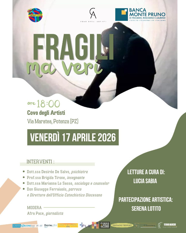 Venerdì 17 aprile, alle ore 18:00, presso il Covo degli Artisti di Potenza (Via Maratea), si terrà “Fragili ma veri”, un incontro aperto alla cittadinanza pensato come spazio autentico di riflessione sul tema della fragilità e del disagio giovanile.