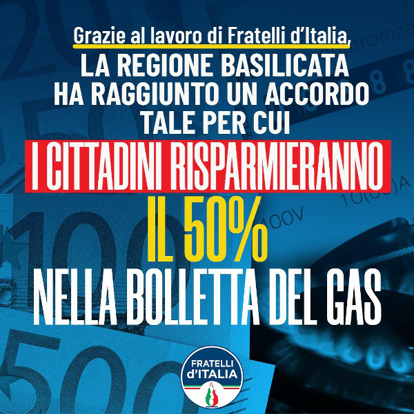 “Grazie al lavoro di Fratelli d’Italia, la regione Basilicata ha raggiunto un accordo sulle compensazioni ambientali sul petrolio tale da far risparmiare alle famiglie lucane il 50% del costo della bolletta del gas”.