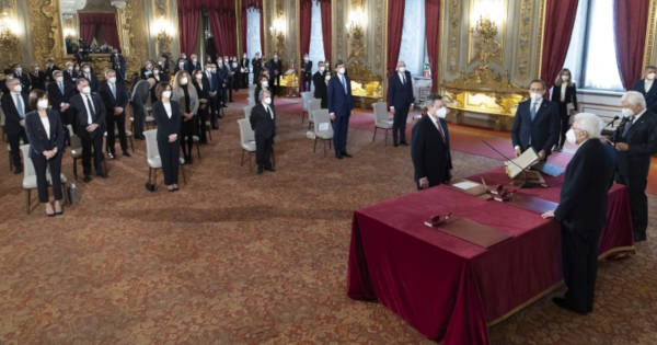 Con qualche minuto di anticipo rispetto all’orario fissato, le 12:00, è iniziato il giuramento al Quirinale davanti al capo dello Stato, Sergio Mattarella, del premier Mario Draghi e di tutti i suoi 23 ministri.