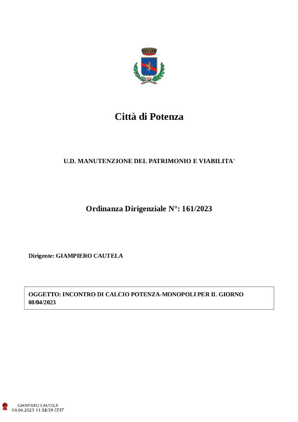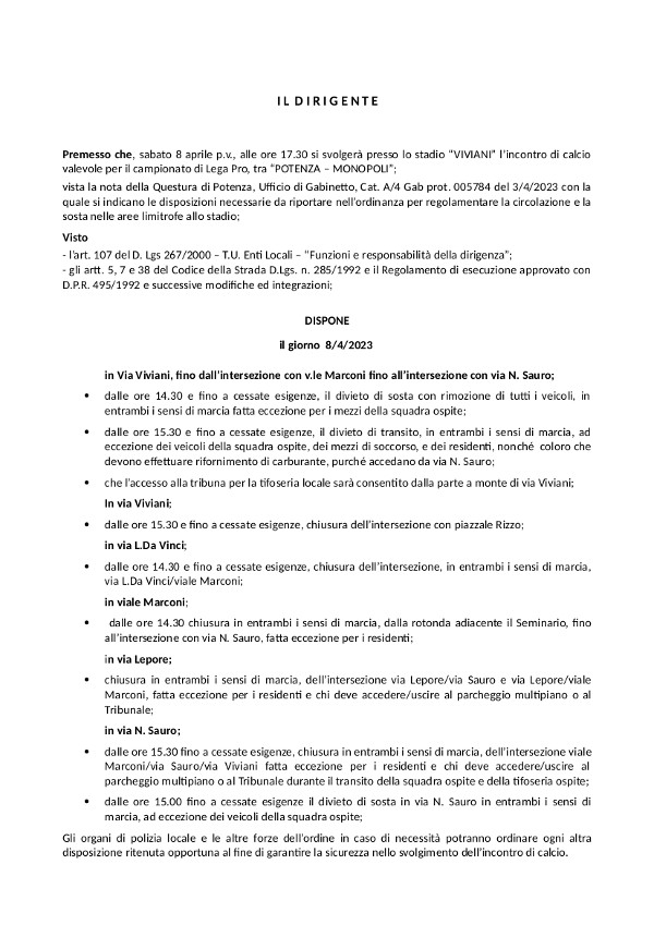 Disposizioni viabilità per l’incontro di calcio valevole per il campionato di Lega Pro, tra “POTENZA – MONOPOLI” che si svolgerà sabato 8 aprile 2023, alle ore 17.30 presso lo stadio “VIVIANI”.