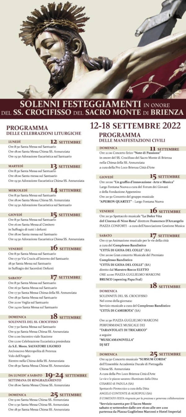 Il Comune di Satriano di Lucania è lieto di annunciare l’avvio dei festeggiamenti in onore del Santissimo crocifisso del Sacro Monte di Brienza: è tra i più antichi d’Italia, è stato costruito nel lontano 1238.