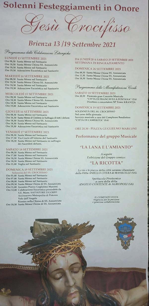 La comunità di Brienza è lieta di annunciare l’avvio dei 783esimi festeggiamenti in onore del Santissimo crocifisso del Sacro Monte di Brienza.