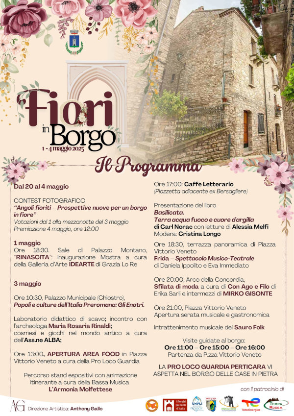 Dal 1° al 4 Maggio 2025 il suggestivo scenario del centro storico di Guardia Perticara (PZ) si trasformerà in un incantevole palcoscenico di colori, suoni e profumi con l’evento “Fiori in Borgo”.