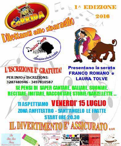 Se possedete un talento particolare non esitate a partecipare alla prima edizione della “Corrida 2016 – dilettanti allo sbaraglio” che si terrà Venerdì 15 Luglio a Sant’Angelo Le Fratte (PZ).