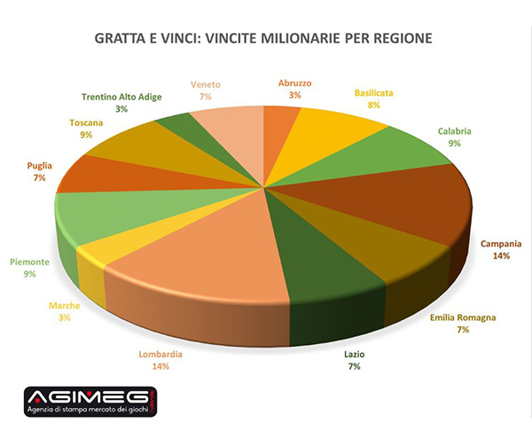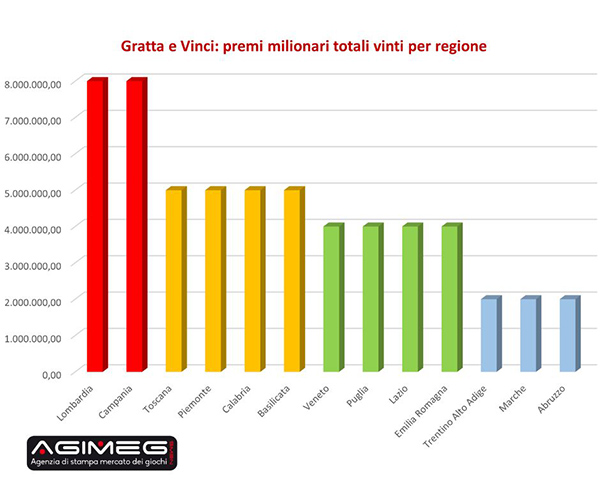 Per quanto riguarda invece gli importi milionari vinti, troviamo in prima posizione a pari merito Campania e Lombardia, con vincite totali per 8 milioni di euro (nei grafici proposti, le regioni sono evidenziate per importi totali vinti)”.