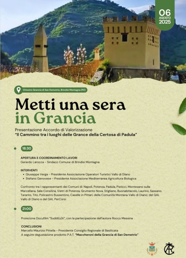 Mercoledì 6 agosto, a partire dalle ore 18.30, presso il chiostro della Grancia di San Demetrio a Brindisi Montagna, sarà presentato l’Accordo di Valorizzazione “Il Cammino tra i luoghi delle Grancie della Certosa di Padula”.