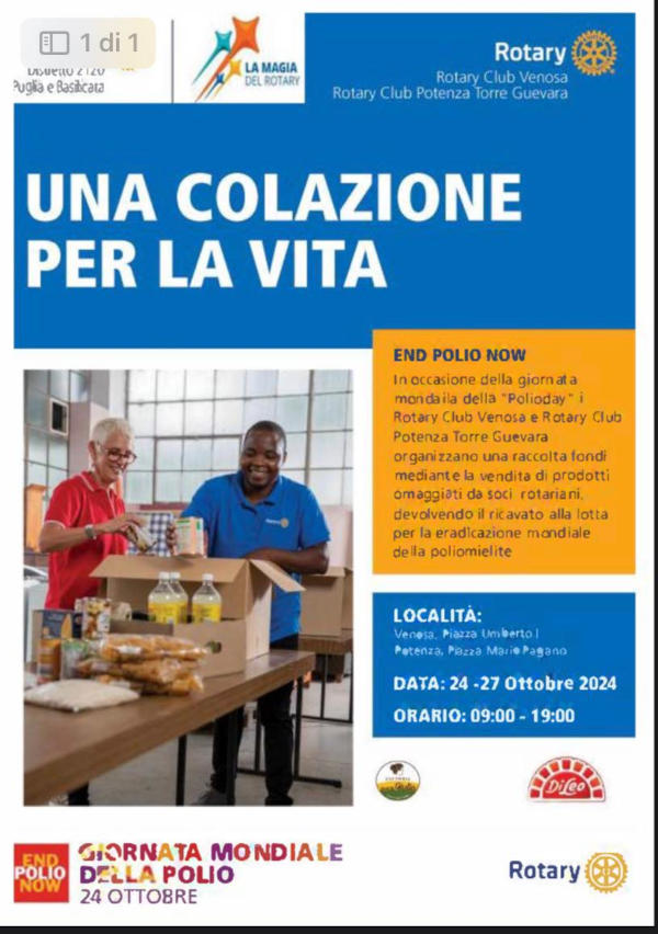 Una colazione per la vita, è l’iniziativa di questa domenica 27 ottobre, a partire dalle 9 in piazza Mario Pagano e in piazza Torre Guevara attraverso la quale il club potentino Rotary Torre Guevara scende in campo per la lotta alla poliomielite nell’ambito delle iniziative rotariane organizzate per la giornata mondiale Polio day.