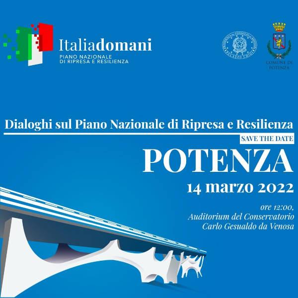 Lunedì 14 marzo, alle ore 12:00, nell’Auditorium del Conservatorio di musica Gesualdo da Venosa – Potenza, si terrà la Tappa lucana di “Italia Domani-Dialoghi sul Piano di Ripresa e Resilienza”, iniziativa promossa da Palazzo Chigi – Presidenza del Consiglio dei Ministri.