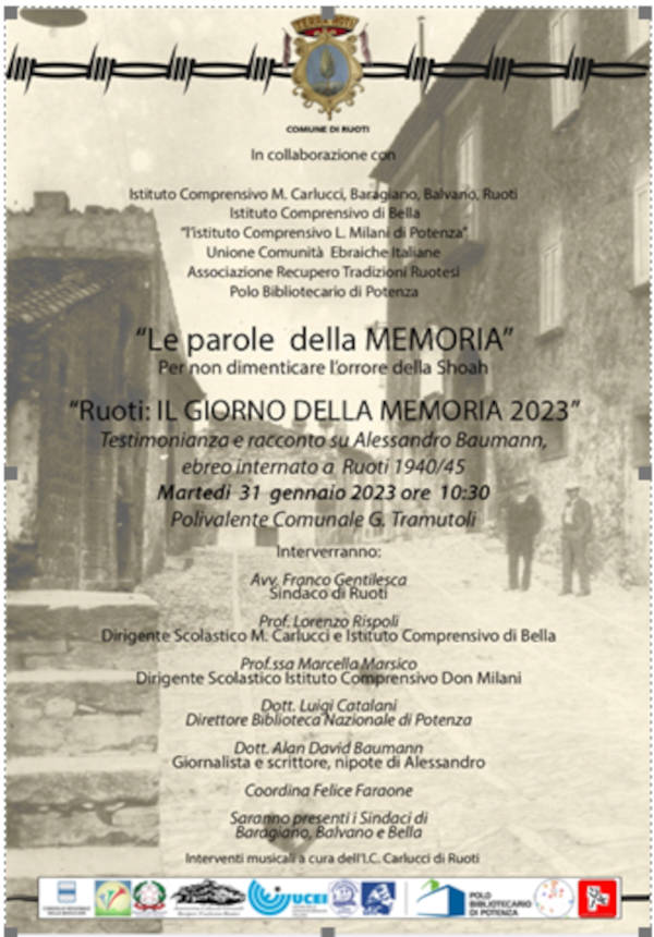 La Giornata mondiale della Memoria (27 gennaio) istituita dall’ONU nel 2005 per celebrare il ricordo delle vittime della Shoah, sarà celebrata a Ruoti nella mattinata di martedì 31 gennaio p.v. presso il Polivalente comunale “G. Tramutoli” con un testimone indiretto, il nipote dell’ebreo Alessandro Baumann internato a Ruoti negli anni 40-45, Alan David Baumann, scrittore e giornalista.