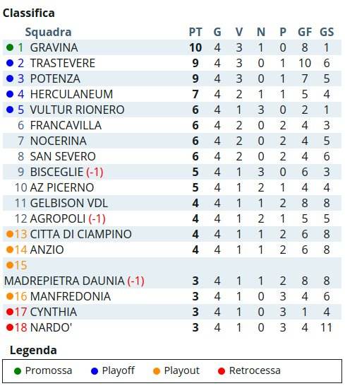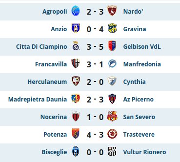 Ecco di seguito tutti i risultati della serie D girone H relativi a questa giornata e la classifica provvisoria, poichè l’incontro Bisceglie Vultur è ancora in corso:
