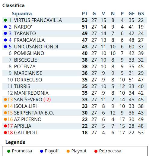 La partita si preannuncia ostica in quanto il Nardò è secondo in classifica generale (a soli 2 punti dalla capolista Virtus Francavilla) ed ha la miglior difesa del campionato (solo 19 reti subite nelle prime 27 giornate di campionato).