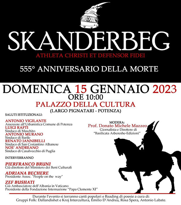 In occasione del 555° anniversario di Giorgio Castriota Skanderbeg, il C.E.ITI & Fondazione internazionale Clemente XI ha programmato un importante evento che si terrà a Potenza il 15 Gennaio 2023, dalle ore 9,30 alle 13,30, nel Palazzo della Cultura in Largo Pignatari.
