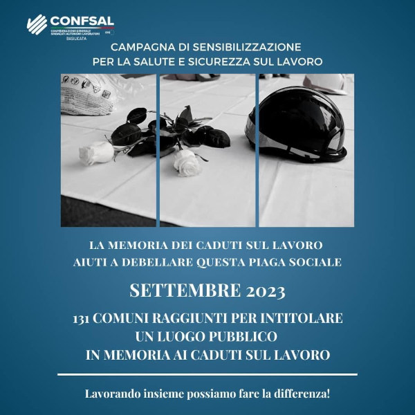 La Confsal Basilicata lancia “Obiettivo 131” , ovvero invitare tutti i comuni lucani ad intitolare un luogo pubblico alle vittime sul lavoro.