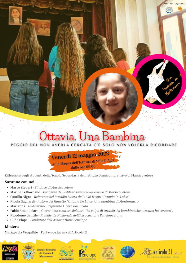 Saranno presenti anche il giornalista Fabio Amendolara, autore del libro ‘La colpa di Ottavia’ e Nicola Gagliardi autore del fumetto, promosso da Libera Val d’Agri, “Ottavia De Luise. Una bambina di Montemurro” e Nicodemo Gentile, presidente dell’associazione Penelope Italia.