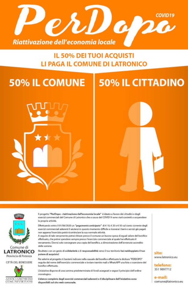 È attivo presso il Comune di Latronico il progetto sperimentale “PerDopo – riattivazione dell’economia locale”, nato in questo periodo di pandemia, per supportare e riattivare l’economia locale del territorio.