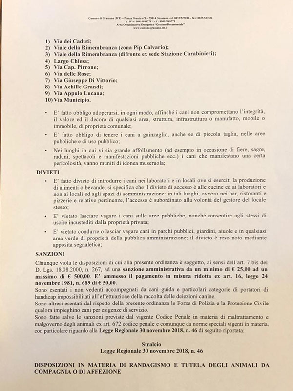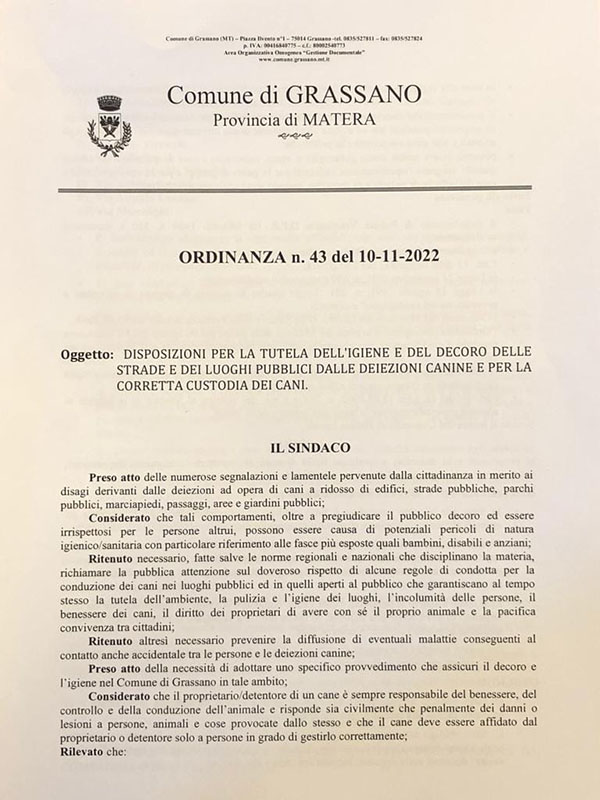 “Con l’ordinanza n. 43 del 10/11/2022 si è ritenuto di intervenire in maniera più incisiva sul rispetto di alcune regole necessarie, già previste da leggi nazionali e regionali, per la conduzione e custodia dei cani al fine di salvaguardare la sicurezza di tutti i cittadini, nonché il rispetto dell’ambiente e l’aspetto igienico-sanitario ed il decoro urbano.