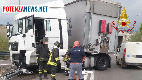 Alle ore 14:50 circa, la squadra dei Vigili del Fuoco del distaccamento di Tinchi, del Comando di Matera, è intervenuta in soccorso di un TIR, con conducente di nazionalità bulgara, che ha impattato il guard-rail dello spartitraffico, sulla SS 407 Basentana al km 100.700, allo svincolo verso la SS 106.