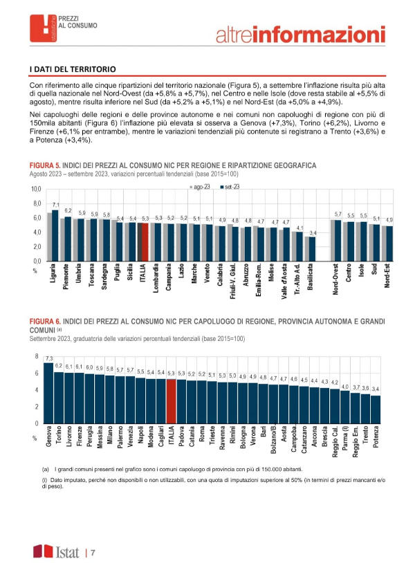 È quanto certifica l’Istat per cui con riferimento alle cinque ripartizioni del territorio nazionale (Figura 5), a settembre l’inflazione risulta più alta di quella nazionale nel Nord-Ovest (da +5,8% a +5,7%), nel Centro e nelle Isole (dove resta stabile al +5,5% di agosto), mentre risulta inferiore nel Sud (da +5,2% a +5,1%) e nel Nord-Est (da +5,0% a +4,9%).