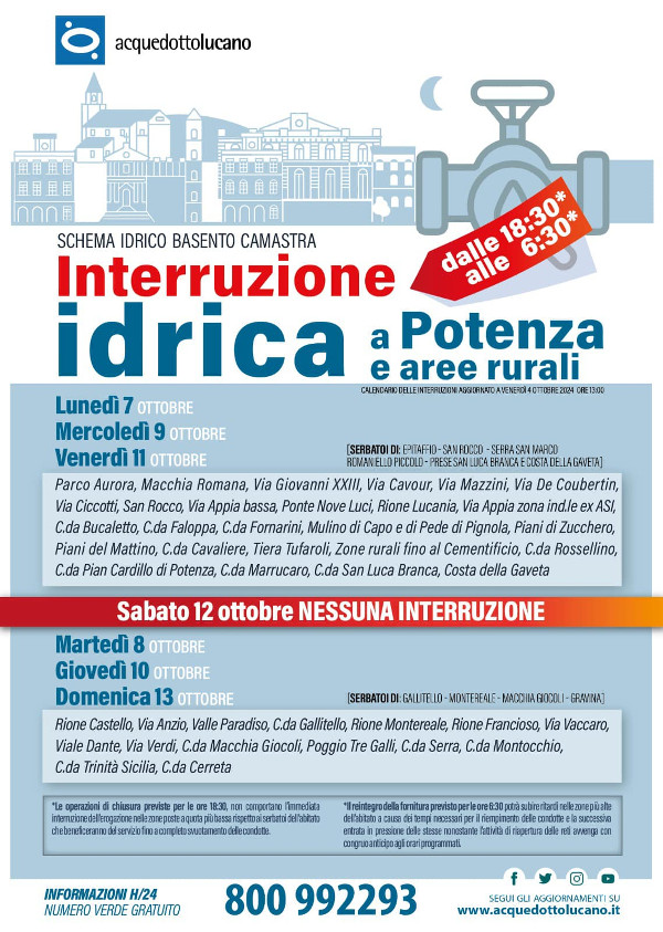 Il Tavolo tecnico regionale ha stabilito il nuovo programma di sospensioni idriche dal 6 all’11 Ottobre che interessa Potenza e le zone rurali.