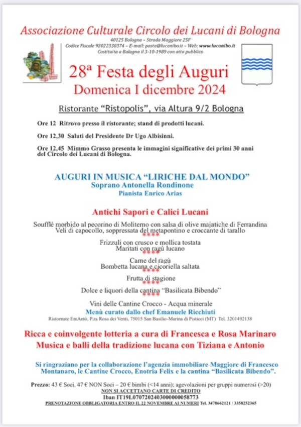 Nella giornata di Domenica presso il Ristorante Ristopolis di Bologna, sarà aperta dalla presentazione delle immagini significative dei primi 30 anni della vita del Circolo Lucani di Bologna illustrate dal suo storico fondatore e mentore dell’Associazione, Mimmo Grasso e dal Presidente Ugo Albisinni e proseguirà, prima della Festa degli Auguri, con “Liriche dal mondo” in musica con la partecipazione della soprano Antonella Rondinone accompagnata dal pianista Enrico Arias.