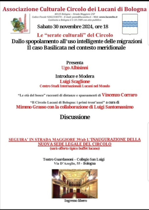 Sarà su questa la traccia che l’Associazione Culturale “Circolo dei Lucani di Bologna“, racconterà e celebrerà i suoi oltre 30 anni di vita del sistema organizzato dei lucani nella città.