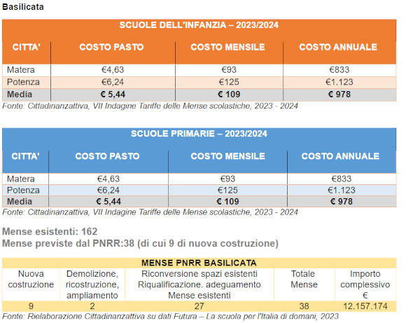In Basilicata, in particolare, si va dai 4,63€ a pasto nelle scuole di Matera ai 6,24€ di Potenza.
