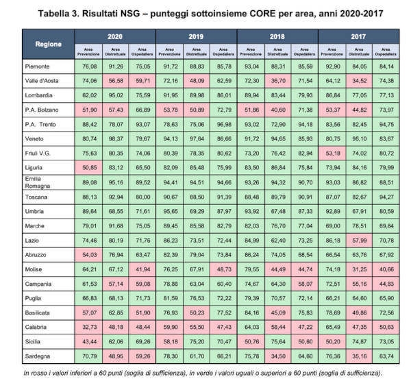 “La verifica LEA è uno dei più importanti strumenti di valutazione dei sistemi sanitari regionali prendendo in considerazione 22 indicatori core distribuiti nelle tre macro–aree dell’assistenza (ospedale, prevenzione e distretto) e che attribuiscono a queste ultime un valore compreso tra 0 e 100, con una soglia di sufficienza che i tecnici del Ministero fissano al raggiungimento di un punteggio pari a 60.