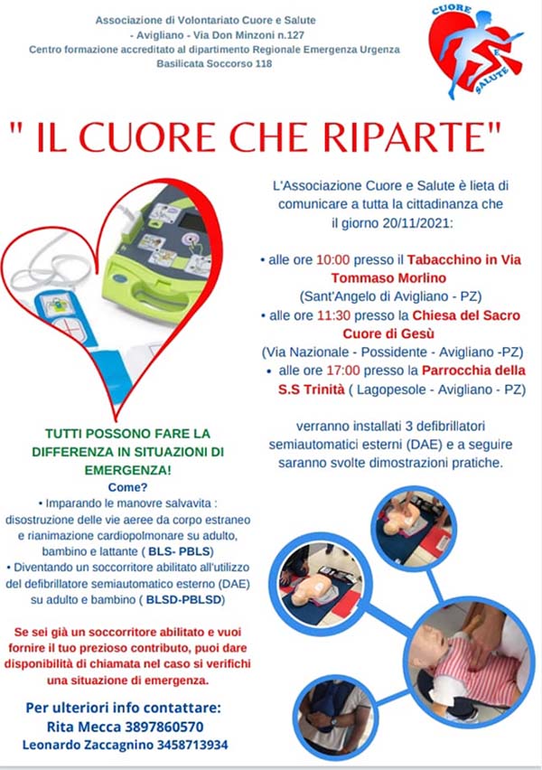 La signora Mecca Margherita, presidente dell’associazione di volontariato Cuore e Salute con sede in Avigliano, è lieta di annunciare alla comunità la prossima installazione dei defibrillatori semiautomatici esterni.