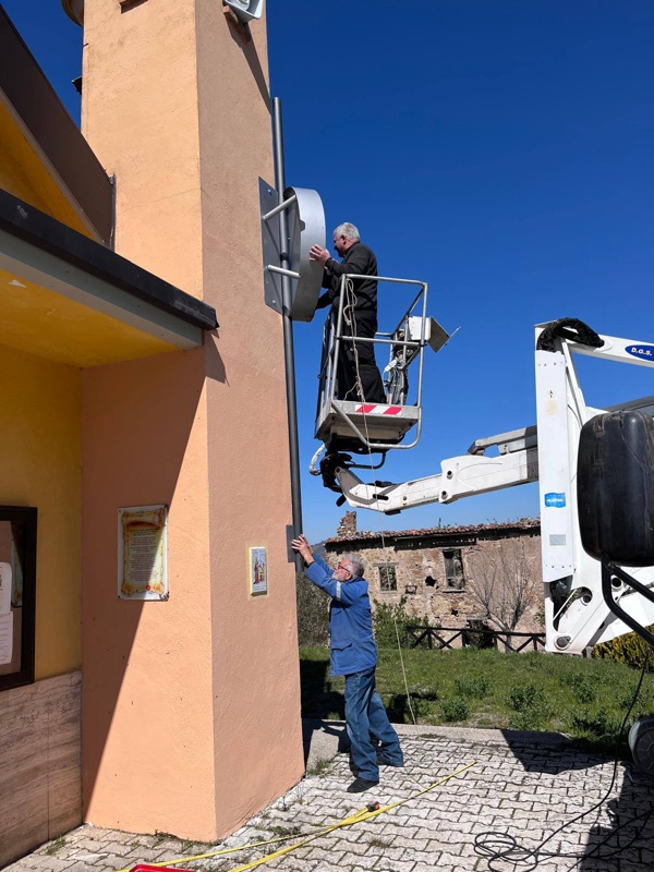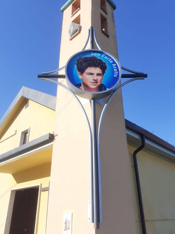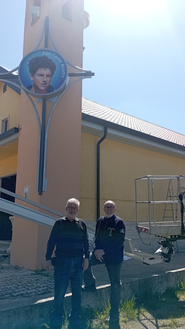“Venerdì 11 Aprile 2025 abbiamo montato una croce con l’immagine del nostro beato Carlo Acutis sul campanile.