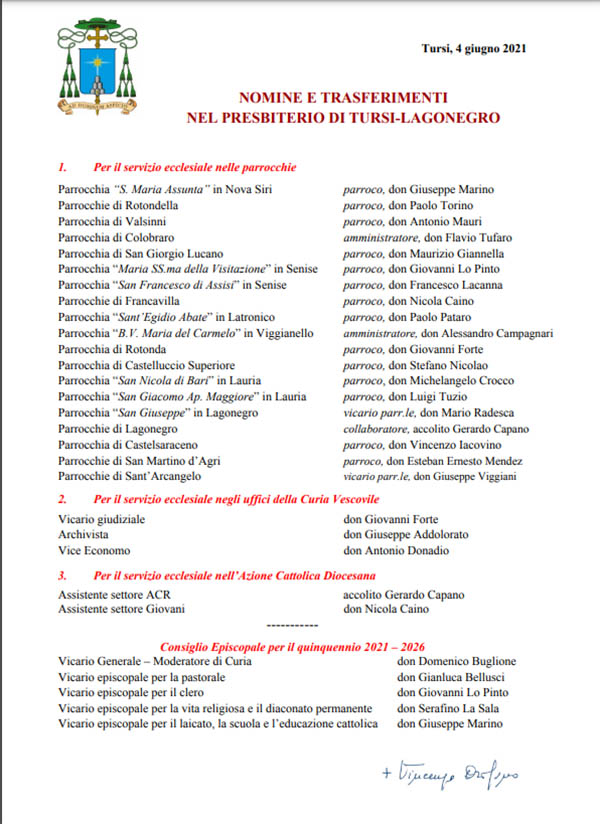 A conclusione del Ritiro spirituale del Clero, in prossimità della Festa del Sacro Cuore di Gesù, Sua Eccellenza mons. Vincenzo Orofino, vescovo di Tursi-Lagonegro, ha reso noti i trasferimenti e le nuove nomine dei Sacerdoti della Diocesi.