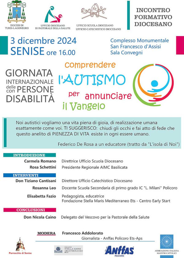 Nella Sala Convegni del Complesso Monumentale San Francesco d’Assisi a Senise, l’ufficio diocesano della salute, in collaborazione con l’ufficio scuola diocesano e l’ufficio catechistico diocesano, con il supporto di Anffas Policoro, Stella Maris Mediterraneo e Aimc Basilicata, ha organizzato un incontro che ha un taglio nettamente formativo, sul tema “Comprendere l’autismo per annunciare il vangelo”.