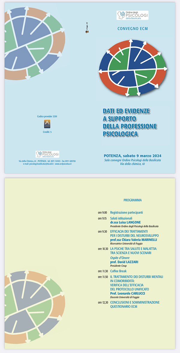 - del prof. Leonardo Carlucci, Ricercatore dell’Università di Foggia, che chiuderà la intensa giornata di lavori, parlando del “Trattamento dei disturbi mentali in comorbidità e verifica dell’efficacia del Protocollo Unificato”.
