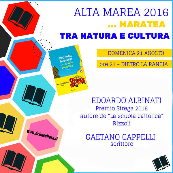 Domenica 21 Agosto 2016 (ore 21.00 -Dietro La Rancia – Centro Storico) la rassegna letteraria Alta Marea 2016, …Maratea tra Natura e Cultura, ideata e realizzata dall’Agenzia Letteraria Delia, in collaborazione con il Comune di Maratea, ispirata al tema “La forza delle parole”, ospita il Premio Strega 2016, Edoardo Albinati, autore de “La scuola cattolica” (Rizzoli).
