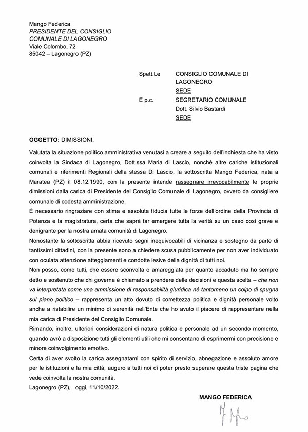 ‘Valutata la situazione politico amministrativa venutasi a creare a seguito dell’inchiesta che ha visto coinvolta la Sindaca di Lagonegro, Dott.ssa Maria di Lascio, nonché altre cariche istituzionali comunali e riferimenti Regionali della stessa Di Lascio, la sottoscritta Mango Federica, nata a Maratea (PZ) 08.12.1990, con la presente intende rassegnare irrevocabilmente le proprie dimissioni dalla carica di Presidente del Consiglio Comunale di Lagonegro, ovvero da consigliere comunale di codesta amministrazione.