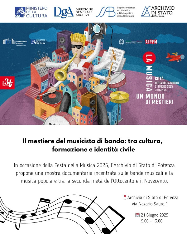 L’Archivio di Stato di Potenza si unisce alla celebrazione della Festa della Musica con un evento speciale: la mostra documentaria “Il mestiere del musicista di banda: tra cultura, formazione e identità civile”.