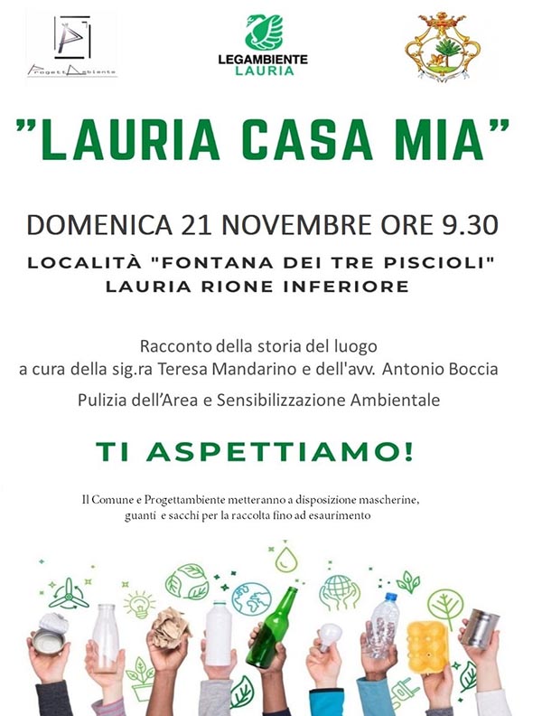 Legambiente Lauria, in continuità con il progetto “Lauria Casa Mia” avviato nei mesi scorsi in collaborazione con il già assessore Donato Zaccagnino, organizza – Domenica 21 Novembre ore 9:30 presso la fontana dei “tre piscioli” rione inferiore – la giornata di pulizia e sensibilizzazione con l’Assessore all’Ambiente Ester Caimo e la Presidente del Consiglio Comunale Lucia Carlomagno.