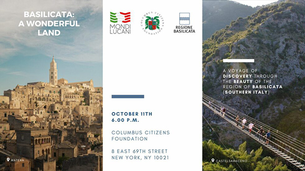 Si svolgerà Mercoledì 11 ottobre alle 18.00 presso la Columbus Citizens Foundation di New York l’evento di promozione turistica “Basilicata: a wonderful land”.