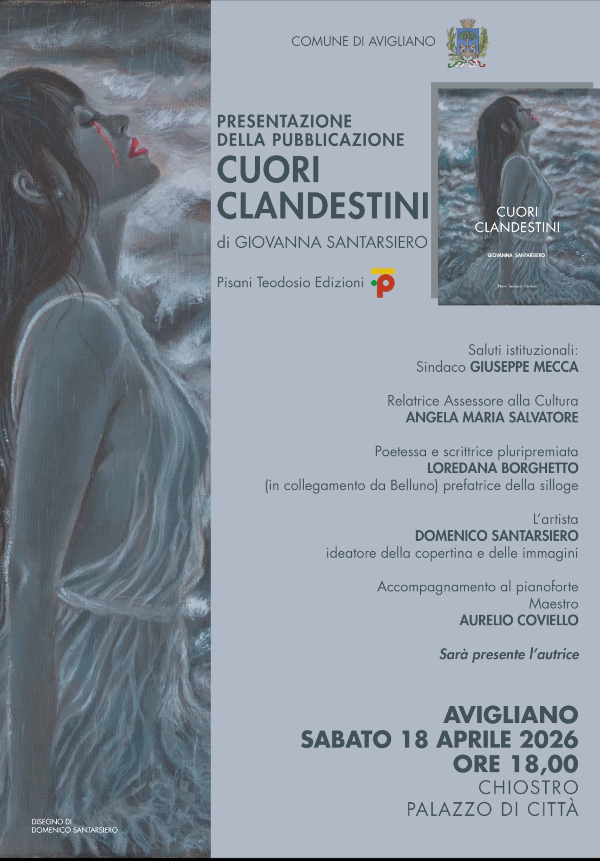 Sabato 18 aprile 2026, alle ore 18:00, presso il Chiostro di Palazzo di Città ad Avigliano, si terrà la presentazione di “Cuori Clandestini”, la seconda raccolta di poesie della giovane poetessa aviglianese Giovanna Santarsiero.