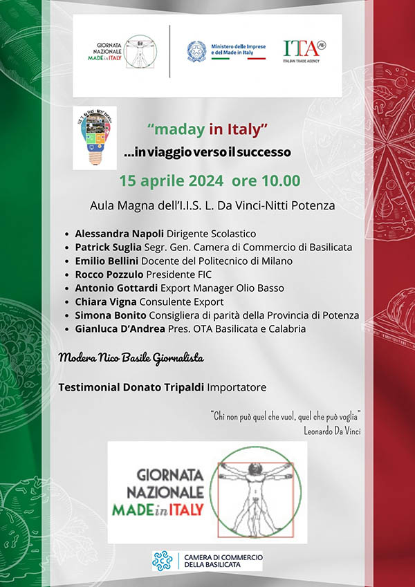 L’I.I.S. L. da Vinci – Nitti di Potenza, rispondendo alla sollecitazione normativa, ha organizzato un convegno, dedicato per l’appunto al Made in Italy, che si terrà proprio il 15 aprile 2024.
