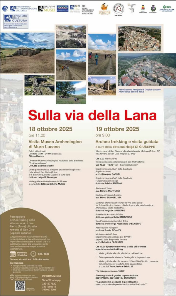 Due giorni da trascorrere insieme lungo “LA VIA DELLA LANA”, con la straordinaria partecipazione di Helga Di Giuseppe, l’archeologa-ricercatrice che ha scavato nelle ville romane di San Pietro (Tolve-Pz) e San Gilio (Oppido Lucano-PZ).