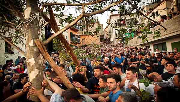 I maggiaioli più esperti, seguiti dai curiosi, si aggirano per il bosco; scrutano le chiome, testano i tronchi, stabiliscono ad occhio l’altezza e alla fine scelgono l’albero più bello e più dritto che sarà tagliato e trasportato in paese il 20 maggio.