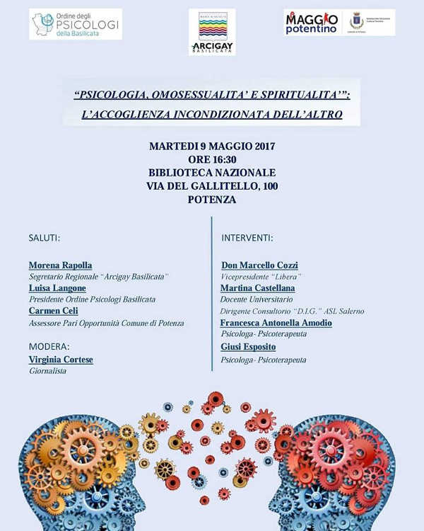 Si terrà Martedì 9 Maggio, alle ore 16:30, presso la Biblioteca Nazionale in via del Gallitello 100 a Potenza, il convegno dal titolo “Psicologia, Omosessualità e Spiritualità: l’accoglienza incondizionata dell’altro”.