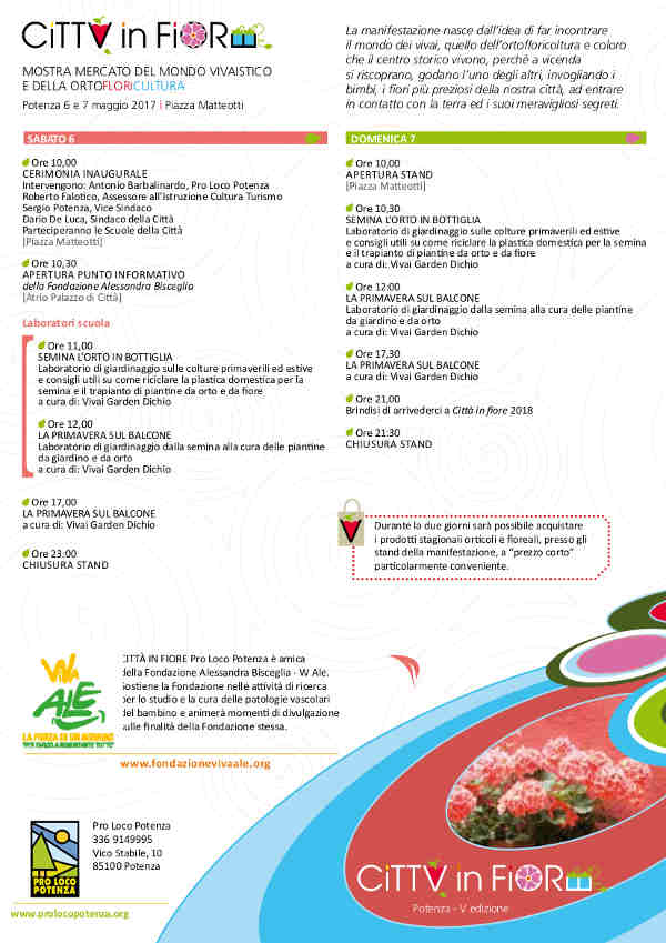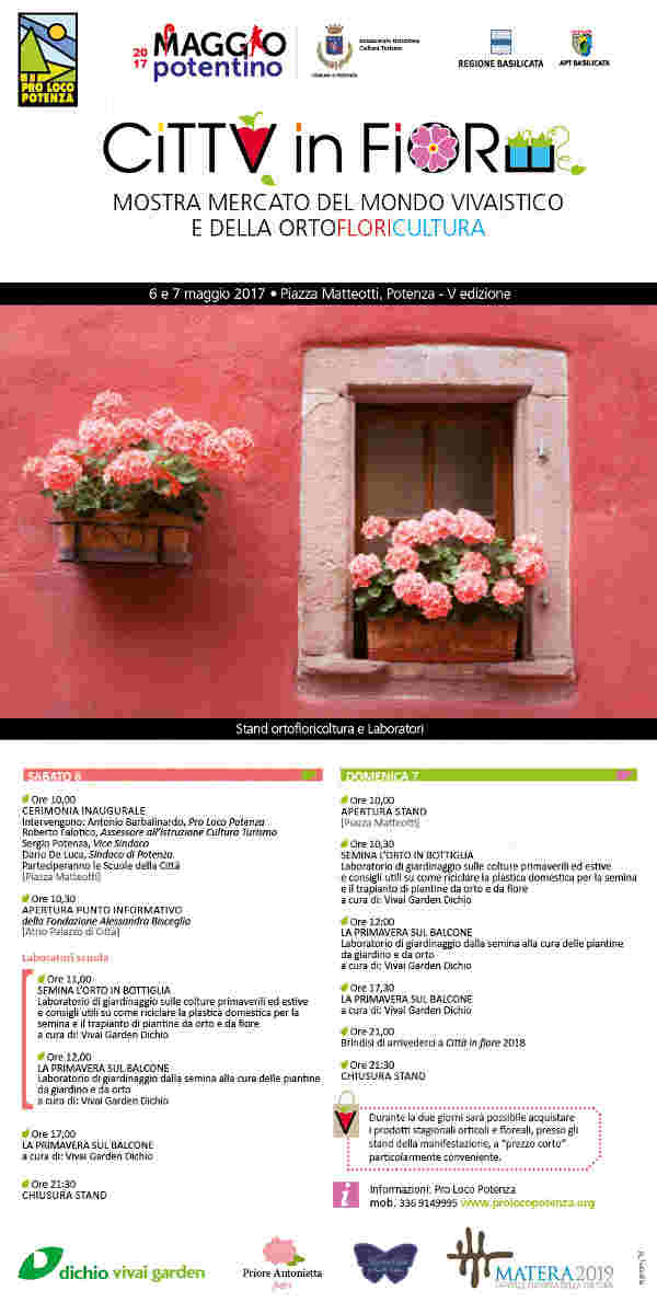 In una rinnovata Piazza Matteotti, si svolgerà la V edizione della Mostra Mercato del mondo vivaistico e della ortofloricUltura targata Pro Loco Potenza e con il patrocinio di Comune di Potenza, Regione Basilicata, Apt.