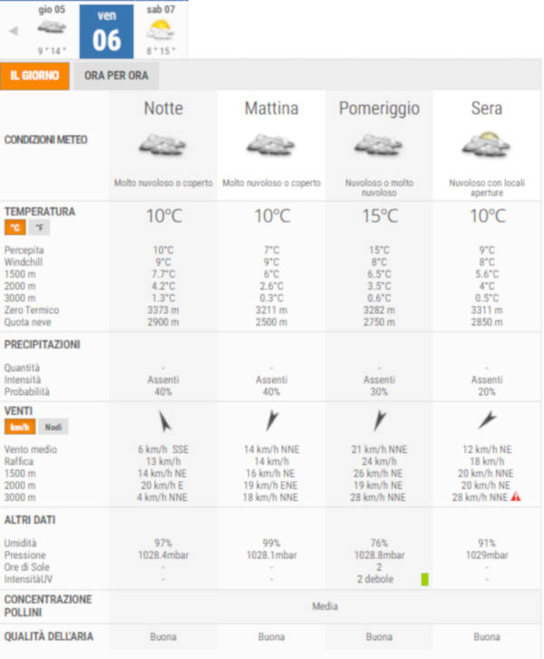 La temperatura massima registrata dovrebbe essere di 15°C, la minima di 8°C.